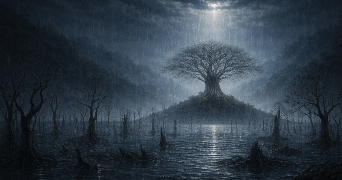 When heaven lost its only child, the first drop of its tear fell upon a Kiquawa tree on a hill. Then it turned into rain that would never end. It rained and rained upon all the creatures of the earth. Day turned into night, and the earth turned into the sea, at the bottom of which the drowned forest stood silently, like a wingless bird without a singing voice.