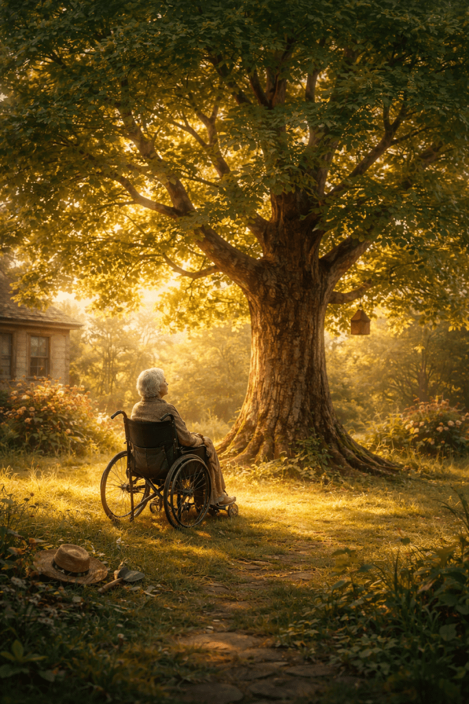 There stood a tree with nothing particular about it. In fact, no one had really noticed it before. It was not young, nor old. It was simply a tree no one paid attention to. The boy pushed her wheelchair to it. She stayed there for a while and died quietly.